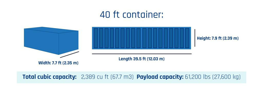 Here are container dimensions for the two standard container sizes, 20′ and 40′: