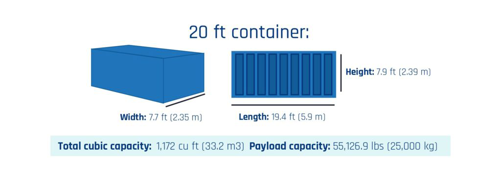 Here are container dimensions for the two standard container sizes, 20′ and 40′:
